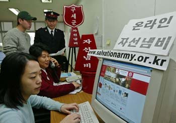 ソウル鍾路区新門路(チョンノグ・シンムンロ)の救世軍の本営事務室で19日、職員たちが今年初めて導入した「オンライン慈善鍋(www.salvationarm.or.kr)」の募金額を集計している。通路の慈善鍋募金は24日まで、オンライン上の慈善鍋募金は今年末まで続く。