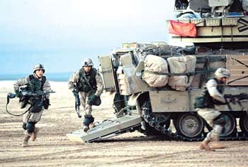 米国のイラク攻撃の可能性が高まっているなか、20日、米海兵隊員たちがイラク国境から約25km離れたクウェートの砂漠で軍事演習を行っている。