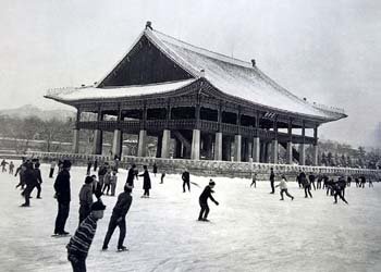 1965年、ソウル市民たちが景福宮(キョンブックン)の慶会楼(キョンフェル)池でスケートを楽しむ姿(上)と、同年に行われた清渓川(チョンゲチョン)にふたを覆いかぶせる工事の様子。国政広報処が24日に発刊した「大韓民国政府記録写真集」の第6巻には、1964〜66年の社会像を証言する多様な記録写真が載せられている。