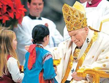 「イエスキリストの愛で世界中に広がっているテロと戦争の脅威を防ごう」法王ヨハネ・パウロ2世は25日、バチカンのサンピエトロ大聖堂で行われたクリスマスイブの深夜ミサでテロと戦争の恐怖がない世界のために努力しなければならないと訴えた。法王がミサで韓国など12カ国の子どもたちを祝福している。