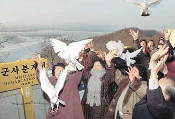 한국기독교총연합회와 탈북자동지회 회원들이 7일 오후 경기 파주시 오두산 통일전망대에서 새해맞이 남북동포 평화통일 기도회를 마친 뒤 북녘 하늘로 비둘기를 날리고 있다.