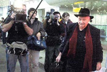 朝鮮民主主義人民共和国(北朝鮮)に対する人道支援の必要性を判断するために国連が派遣した特使のモリス・ストロング国連事務総長特別顧問(右)が7日、北朝鮮入りするため中国の北京空港に到着し、各国報道陣の取材を受けている。