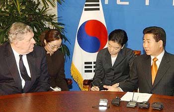 盧武鉉(ノ・ムヒョン)次期大統領が13日、ソウル世宗路(セジョンロ)の政府庁舎別館に設けられた執務室で、ブッシュ米大統領の特使として来韓したケリー国務次官補(東アジア・太平洋担当)と会談し、韓米同盟関係の重要性や北朝鮮核問題の平和的解決を強調している。