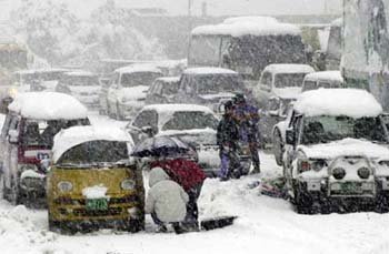 14日、江原道江陵(カンウォンド・カンルン)地方に約30センチの大雪が降り、嶺東(ヨンドン)高速道路大関嶺(デグァンリョン)を通るため、運転者たちが道路周辺で車にチェーンを巻いている。