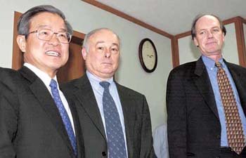 米国の格付け会社であるムーディーズ社の国家信用評価チームのトーマス・バーン局長(右)とスティーブン・ヘス先任研究員(中央)が20日、果川(クァチョン)庁舎で権(クォン)テシン財政経済部国際金融局長との協議を前に歓談を交わしている。ムーディーズ社の代表団は、北朝鮮の核問題などが韓国の国家信用に与える影響を点検するために来韓した。