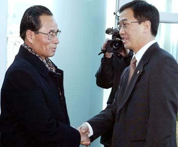 11日午後、仁川(インチョン)国際空港に到着した第4回南北経済協力推進委員会の北朝鮮側の代表を務める朴チャンリョン国家計画委員会第1副委員長(左)が、統一部のチョ・ミョンギュン交流協力局長とあいさつを交わしている。