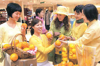 서울 현대백화점 천호점 직원들이 5일 오렌지빛 봄소식이라는 테마로 노란색의 옷이나 장신구, 가방을 착용한 고객 100명에게 오렌지를 나눠주고 있다. 이 행사는 9일까지 매일 오후 45시에 열린다.