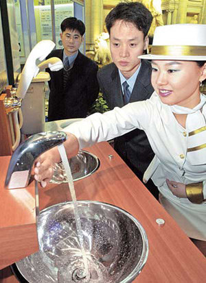 ソウル松坡区蚕室(ソンパグ・チャムシル)ロッテワールドのトレビ噴水広場で27日まで、エネルギー管理公団が開いている省エネ製品展示会で、女性ボランティアが省エネ商品を紹介している。