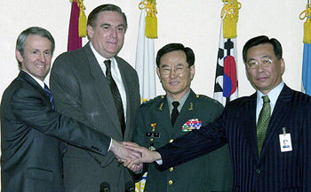 将来の望ましい韓米同盟の在り方について協議するための初会議が8日、国防部で開かれた。韓国側首席代表を務める国防部の車栄九(チャ・ヨング)国防政策室長(右から2人目)とリチャード・ローレス米国防副次官補(左から2人目)が手をつないでポーズを取っている。