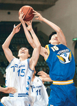 延世大学は11日、漢陽大学の激しい追い上げに苦戦を強いられた。バン・ソンユン(25点)、李ジョンソク(18点)のゴール下突破と、李ジョンヒョプ(14点)の外郭シュートで前半を45−34でリードした延世大学は、第3クオーターから追い上げられ、第4クオーターに入るや、漢陽大学の金ソンヒョンにゴール下シュートを決められて、73−74と逆転された。