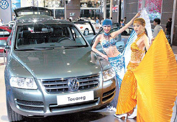 1일 서울 강남구 대치동 서울무역전시장에서 열린 2003 수입자동차모터쇼 언론공개행사에서 폭스바겐이 국내에서 첫선을 보인 스포츠유틸리티차량 투아렉. 모델들이 북아프리카 투아렉족의 의상을 입고 사진기자들에게 포즈를 취하고 있다.