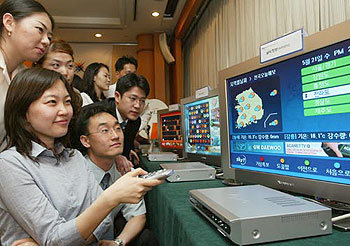 21日、ソウル中区小公洞(チュングソゴンドン)のウェースティン朝鮮ホテルで、衛星放送事業社「Sky−life」の職員が双方向衛星TVの放送を試演している。気象情報、証券、ゲームなどの情報を、コンピューターを操作するようにリモコンで選択できるこの放送は双方向受信機を購入すれば、今年末まで無料で利用できる。