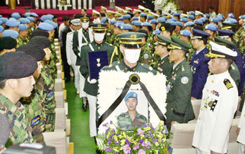 3月、東ティモール国連平和維持軍(PKF)の任務を遂行していたところ、急流に流されて行方不明になっていた故金ジョンジュン兵長の告別式が21日、ソウル銅雀区銅雀洞(ドンジャク・ドンジャクドン)の国立墓地で行なわれた後、軍人が金兵長の影像を持って退場している。