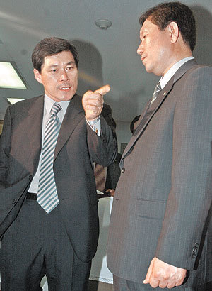27日、李君賢(イ・グンヒョン)韓国教員団体総連合会(教総)会長(左)が教育人的資源部を訪れて、長官の辞任要求書を渡す前に、ソ・ボンソク教育部次官に全国教職員労働組合(全教組)の要求に屈服して、NEISをあきらめたのではないかと追及している。