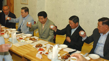 盧武鉉(ノ・ムヒョン)大統領(中央)が1日、ソウルのある蔘鷄湯(サムゲタン)の店で、先月訪米に同行した財界人らと昼食を共にし、乾杯している。左側から孫吉丞(ソン・ギルスン)全経連会長、李健熙(イ・ゴンヒ)三星(サムスン)会長、盧大統領、具本茂(ク・ボンム)LG会長、鄭夢九(チョン・モング)現代(ヒョンデ)自動車会長。