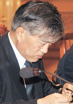 文在寅(ムン・ジェイン)大統領民情首席秘書官が5日、大統領府で開かれた首席秘書官・補佐官会議で、固い表情で何かを考えている。