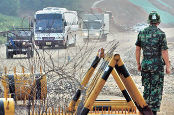北朝鮮の開城(ケソン)で開かれている、第5回南北鉄道及び道路連結実務協議に参加している韓国側代表団を乗せた車両が8日、京義(キョンウィ)線の臨時道路を通じて南北軍事境界線を越えている。