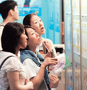 16日午後、ソウル江南区三成洞(カンナムグ・サムソンドン)COEXモールで開かれた「若年層のための採用博覧会」で、求職者たちが求人掲示板を注意深く見ている。