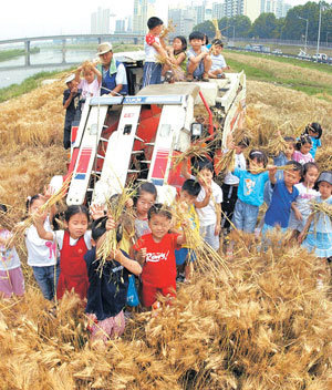 麦収獲体験行事に参加した幼稚園児らが17日、ソウル広津区(クァンジング)中谷(チュンゴク)3洞の中浪川(チュンランチョン)の水辺で収穫した麦を持ち上げて見せている。広津区は4000坪余りの畑で収穫した麦、約50俵を区内の恵まれていない家庭に配る計画だ。
