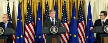 조지 W 부시 미국 대통령(가운데)이 25일 미-유럽연합 정상회담 뒤 유럽회의 의장인 콘스탄티노스 시미티스 그리스 총리(왼쪽), 로마노 프로디 유럽 집행위원회 회장과 함께 공동 기자 회견을 갖고 있다.