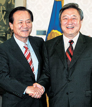 ハンナラ党の崔秉烈(チェ・ビョンリョル、左)、民主党の鄭大哲(チョン・デチョル)代表が30日午後、国会議長室で朴𨛗用(パク・グァンヨン)議長の取り持ちで、顔合わせ兼両党代表の会合を行う前に、嬉しく握手を交わしている。
