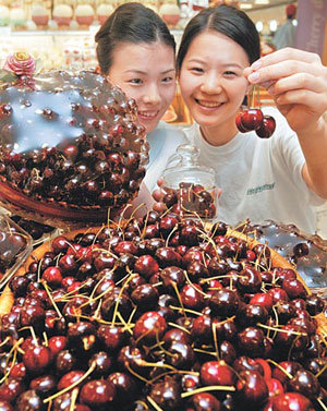 2日、現代(ヒョンデ)デパートソウル狎鴎亭(アプクジョン)本店で、販売員が甘酸っぱい米国産チェリーを持ち上げて見せている。米国産チェリーは100グラム当たり1400ウォン台で、6日まで限定販売する。