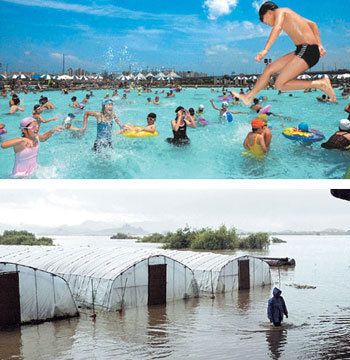 13日、ソウルで雨の止んだ後、厳しい暑さの中で、青少年たちが汝矣島(ヨイド)にある漢江(ハンガン)市民公園のプールを訪れて、水の中で暑さをしのいでいる(上)。洛東江(ナクドンガン)下流地域である慶尚南道密陽市下南邑(キョンサンナムド・ミルヤンシ・ハナムウプ)のある農民が12日、大雨で膝の上まで浸った水をかきわけながら、ビニールハウスを見てまわっている。