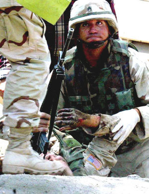 イラクのバグダッドに駐留中の米軍兵士が、16日、フセイン派残党と思われるイラク人の発射した銃弾を受けて重傷を負った同僚兵士を沈痛な表情で見つめている。