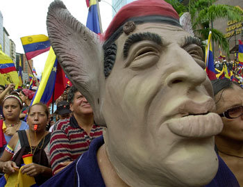 20日ベネズエラの首都カラカスで「反チャベス」デモに参加した市民がロバの耳の模様をつけたウゴ・チャベス大統領の仮面をつけて、野党の政治家の演説を聞いている。同日、数千人がチャベス大統領の信任を問う国民投票を求めてデモを繰り広げた。