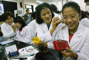 30日、ソウル西大門区大峴洞(ソデムング・デヒョンドン)の梨花女子大で開かれた「お母さんとともに行う女子学生プログラム」に参加した小学生たちが、自分の手で作った紙コップのスピーカーでラジオを聞いている。