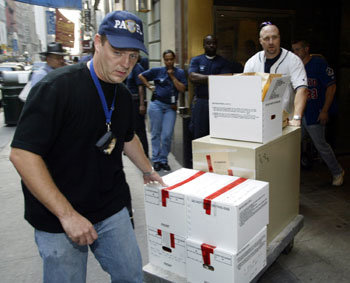 米連邦捜査局(FBI)が、12日、ニューヨークのジュエリー・ショップ通りのあるビル内事務室を急襲して押収した資料を運んでいる。同日の急襲は地対空ミサイルを密搬入した兵器取引業者らと関連があるものとみられている。