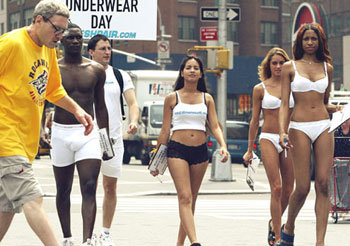 下着だけを着ているモデルが「下着の日」制定の請願書の署名をもらうため、13日(現地時間)米国ニューヨークユニオン広場を堂々と歩いている。ショートパンツに半そで姿のモデルの前を、うつむき加減に横切るニューヨーク市民の姿がもどかしい。