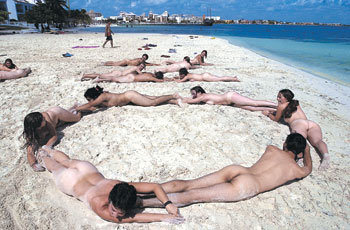 第5回世界貿易機関(WTO)閣僚会議の開幕2日前の8日(現地時間)、開催地メキシコの休養都市カンクンの海辺で、反グローバル化を唱える人々が「WTO反対(No To The WTO)」の「No」の字を裸の体で表現している。