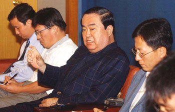 文喜相(ムン・ヒサン)大統領秘書室長(中央)が、13日、大統領府春秋館で記者懇談し、米国のイラク派兵要請と台風14号による被害などについて説明している。