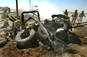米軍の復旧チームが14日、イラクのファルージャで爆弾攻撃を受け、原型を止めぬほど爆破された米軍車両の残骸を片付けている。同日の攻撃で米軍兵士1人が死亡し、3人が負傷した。