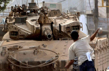 29日、ヨルダン川西岸のある難民キャンプでパレスチナ人少年がイスラエル軍戦車に向かって石を投げている。中東和平ロードマップ(段階的履行案)が暗礁に乗り上げたことでパレスチナ人たちのイスラエルに対する反感が高まっている。