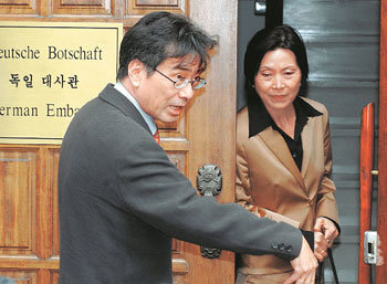 ドイツ市民権者でドイツ在住の社会学者、宋斗律(ソン・ドゥユル)氏が5日、検察の調べと関連し、弁護人の立会い権問題などを協議するため、夫人と一緒にソウル龍山区東氷庫洞(ヨンサング・トンビンゴドン)にあるドイツ大使館に入ろうとしている。