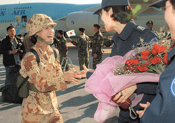 6ヶ月間のイラク派兵任務を終了して、16日ソウル空港に到着したジェマ部隊のある看護将校(左側)が韓国にいた同僚たちと喜んで再会している。