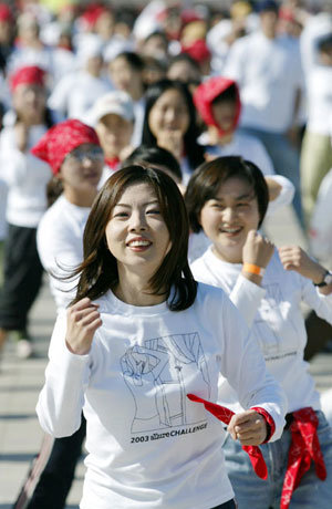 19日ソウル松坡区(ソンパグ)オリンピック公園の広場で、心身の健康を追及する「ウェル・ビーイング(Well Being)族」の女性およそ1500人が参加した女性マラソン大会が開かれた。参加者は講師の指導に従って準備運動をしている。