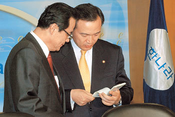 ハンナラ党のの洪思鄹(ホン・サドク)院内総務(左側)が21日、ソウル汝矣島(ヨイド)の党本部で開かれた主要党役員会議で任太熙(イム・テヒ)秘書室長の手帳を一緒にのぞき込んでいる。