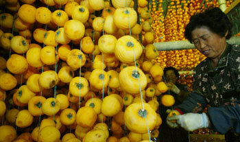 秋が深まるにつれて、干し柿を作る手許が忙しい。30日慶尚北道尚州市南長洞(キョンサンブクト・サンジュシ・ナムジャンドン)のある干し柿農場の乾燥台にずらりと下げられた柿の色が美しい。