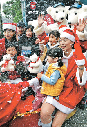 韓国コカ・コーラの社員たちが12日、サンタークロースに扮してソウル中区(チュング)のドゥーター広場で「北極熊と100家族の温かい冬イベント」を催している。同社は来年1月末まで、コカ・コーラ1.5リットル入りペットボトルの蓋の内側にプリントされたクジの当選者に、家族旅行券100枚、スノーボード200枚、北極熊人形1万個をプレゼントする。