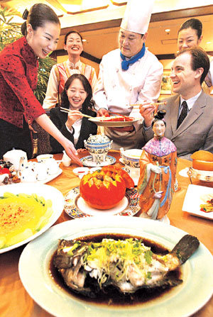 ソウル新羅(シンラ)ホテルの中国レストラン八仙は25日、清国の皇室料理「譚家」を集中的に紹介するイベントを開いた。来月1日まで続くこのイベントは中国北京ホテルのコック長(中央、白い服)が直接製作した料理を清国の衣装を着た職員たちがサービングする。
