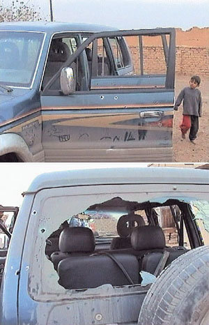 30日、イラク北部都市のティクリット近くの高速道路でオム電機の職員らが被撃された時に乗っていた日本製の四輪駆動車。車の左側のドア(上)と後ろのドア(下)のあちこちに残っている弾痕と割れた窓ガラスが悽惨だった瞬間を物語っている。