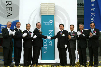 大韓貿易投資振興公社(KOTRA)は5日、ソウル瑞草区廉谷洞(ソチョグ・ヨムゴクトン)の本社でインベストコリアのアレン・ティンブリック団長に任命状を授与し、開所式を行った。インベストコリアは、外国人投資の誘致業務を専門的に取り扱う。左から、オバリン駐韓米商工会議所会頭、モリス駐韓英国大使、呉盈教(オ・ヨンギョ)KOTRA社長、ティンブリック団長、金振杓(キム・ジンピョ)副首相兼財政経済部長官、尹鎮植(ユン・ジンシク)産業資源部長官、鞖洵勲(ベ・スンフン)北東アジア中心プロジェクト推進委員長、カルフのフィリップ・ブロヤニゴ社長。