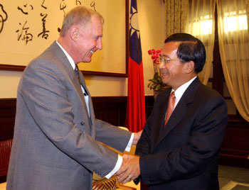 陳水扁台湾総統(右)が温家宝中国首相とブッシュ米大統領の首脳会談翌日の10日、タイベイの執務室で米下院のドーン・バートン(共和党)議員に会って、「中国は台湾の独立投票に反対してはいけない」と強調している。