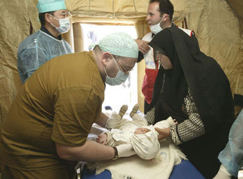 大地震から4日目となる29日、イラン南東部のケルマン州バム市の野戦病院は一刻を争う負傷者たちのために常に緊張が漂う。急いで子供を病床に横たえて検診にとりかかろうとするロシア人医者。そばの母親が切ない表情だ。