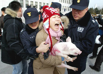 30日、ある女性農民が韓国とチリ間の自由貿易協定(FTA)批准反対を主張して、ソウル汝矣島(ヨイド)の国会に入って、豚4、5匹を放してデモを行い、警察の制止を受けた。