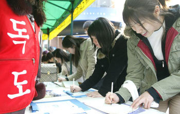 独島(ドクト、日本名・竹島)歴史回復運動本部の主催で15日、ソウル中区明洞(チュング・ミョンドン)で開かれた「独島領有権回復国民署名」行事におおぜいの人々が参加している。