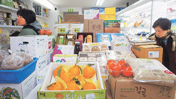 「値段は少し高いけど、100%有機食品だけを売ります」。組合方式で運営されるソウル麻浦区西橋洞(マポグ、ソギョドン)麻浦ドゥレ生活共同組合の売場で、主婦が食材を見ている。